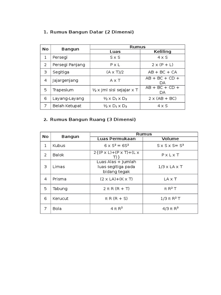 Detail rumus bangun datar beserta gambarnya pdf dapat kamu nikmati dengan cara klik link download dibawah dengan mudah tanpa iklan yang mengganggu. Luas dan keliling bangun datar 1 soal kelas 6 sd 1. Contoh bangun ruang antara lain kubus, balok, prisma, tabung, kerucut, limas dan bola. Bangun datar adalah suatu bidang rata/datar yang dibatasi oleh garis lurus atau garis lengkung, sehingga menyatu dan membentuk bangun dua dimensi yang memiliki panjang dan lebar, tetapi tidak memiliki ketinggian. Namun pada intinya, rumus dari bangun […] artikel terbaru. Bangun datar terdiri dari berbagai bentuk seperti persegi persegi panjang segitiga trapesium. Dimensi besaran pengertian amp fungsi rumus contoh. Rumus luas belah ketupat = ½ x d1 x d2. Rumita hasanah geometri datar dan ruang.