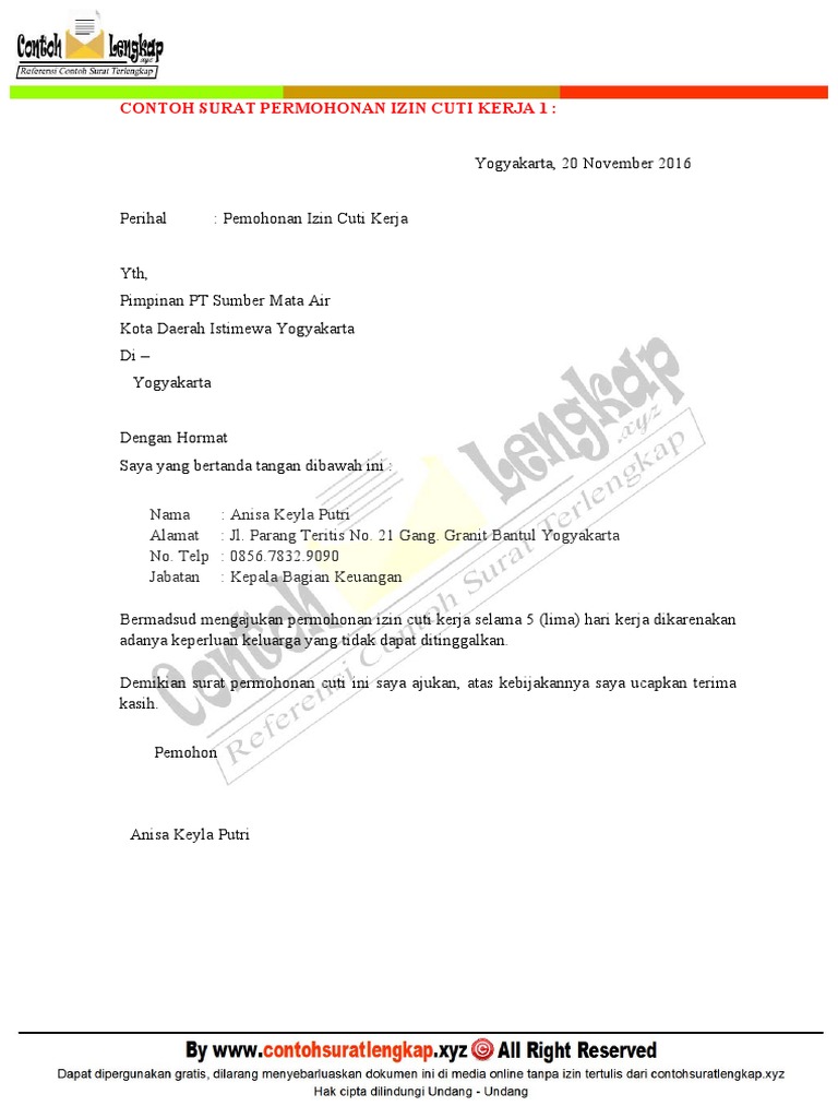 Surat cuti ialah sebuah surat yang berisi tentang permohonan seorang karyawan untuk tidak hadir ke tempat kerja selama beberapa waktu karena adanya alasan tertentu. Description of contoh surat permohonan perpanjangan cuti kerja: Contoh surat izin cuti kuliah. Contoh surat pengajuan cuti kerja contoh surat baik merujuk ke uu ketenagakerjaan, pasal 82, cuti melahirkan merupakan hak bagi karyawan perempuan dengan ketentuan 1,5 bulan sebelum melahirkan. Ada banyak hal yang menyebabkan seorang mahasiswa/i untuk mengambil cuti. Salah satu hak yang dimiliki para pekerja adalah hak cuti, dan salah satunya adalah hak cuti tahunan. Pengajuan cuti semacam ini biasanya disertai dengan surat keterangan dari dokter atau rumah sakit apabila diperlukan. Hak cuti karyawan di indonesia dan contoh surat cuti. 8 contoh surat cuti berbagai macam kegunaan sesuai keperluan. Hal ini penting tidak hanya sebatas untuk memberitahu ketidakhadiran di kantor, namun juga untuk membantu atasan.